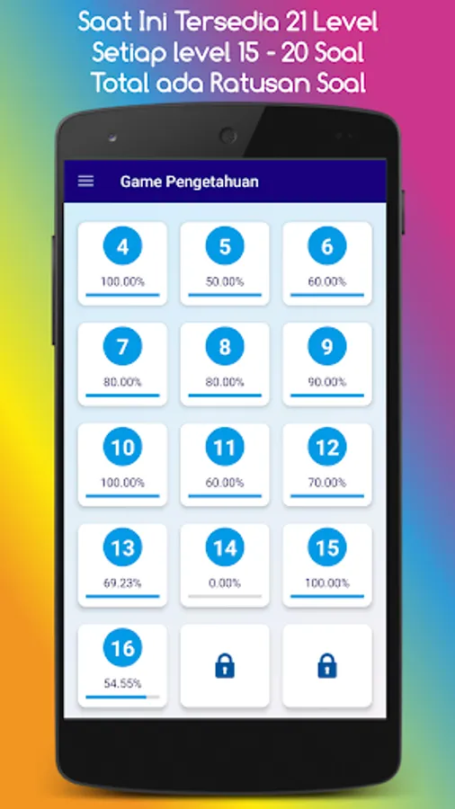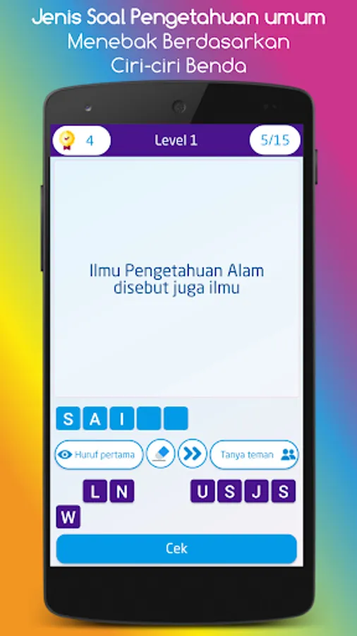 In addition to expanding knowledge, for fun, this game is also good for sharpening your brain because it is enriched with puzzle questions. Overcome your boredom while waiting for a long queue by answering the puzzles in this game. Or when you are resting at the office or when you are stuck in traffic in a car or public transportation.