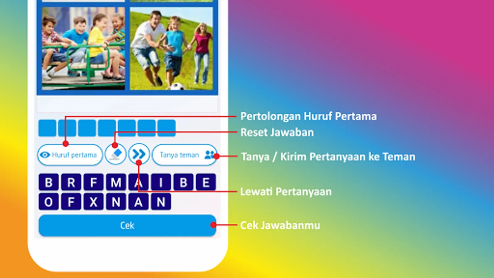 The questions in this guessing game are presented in text form, as the name suggests, there are also pictures so that it will add to the fun of having fun expanding your knowledge and sharpening your brain.