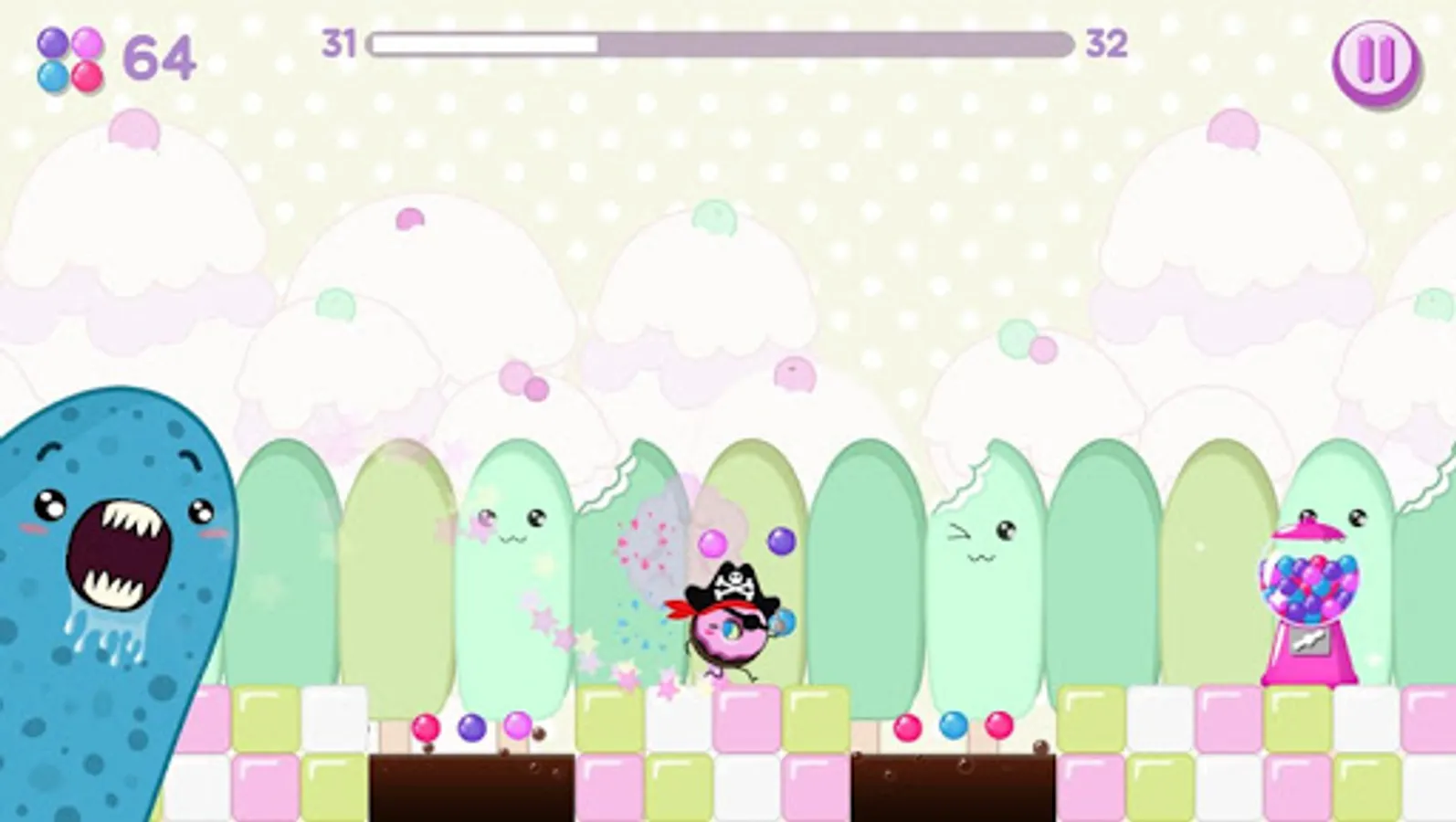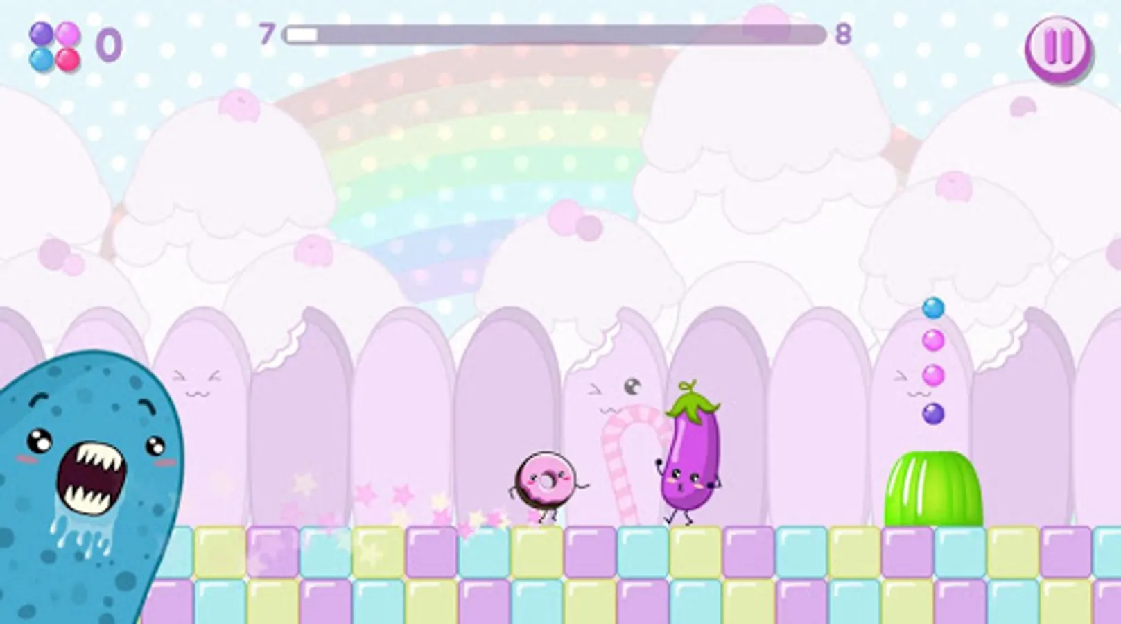 The game management is very simple, in the menu you shall select with a tap the section “Play”, and you will transfer yourself to a saturated and bright sweet world. Though, the funny atmosphere doesn’t mean that playing is simple, as the endless runner is constantly accelerating the game speed and requires more and more energy and concentration, to manage the obstacles successfully.