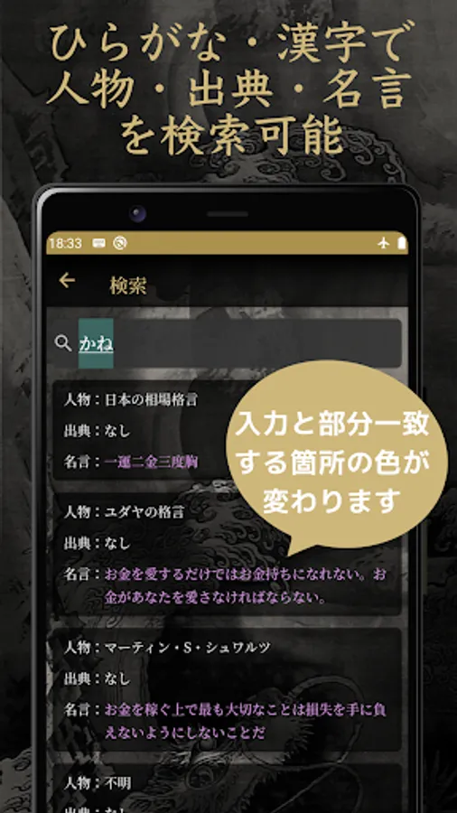 ○ If you enter "Hiragana" or "Kanji" from the search screen, the characters, sources, and quotes that include the entered characters will be narrowed down.