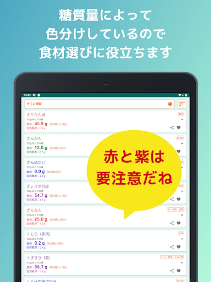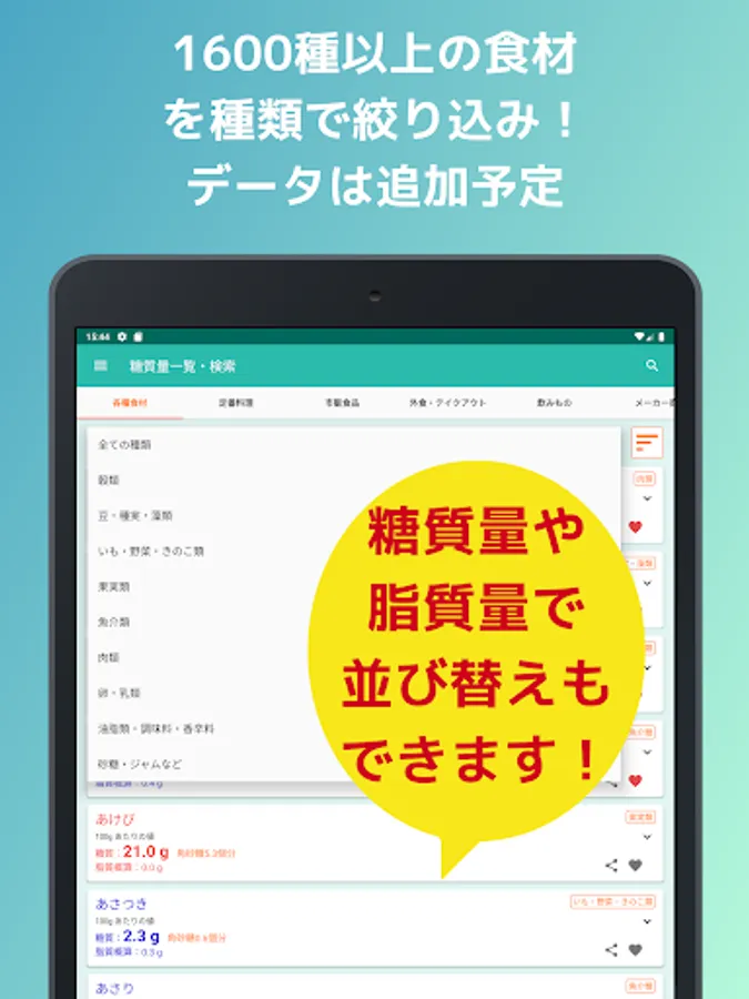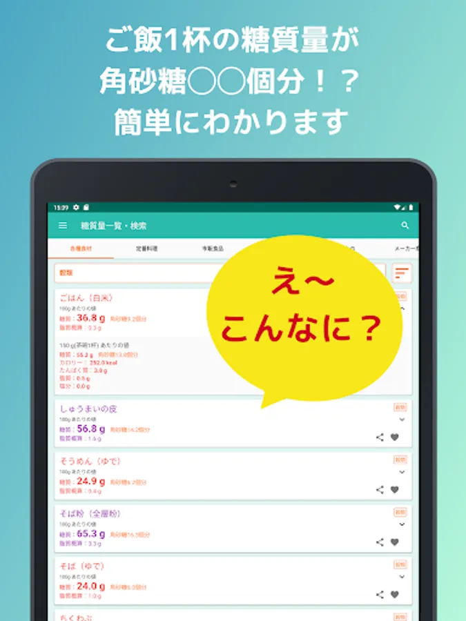 ポケット糖質量は1600種類以上の食品に含まれる糖質量が検索できるアプリです。