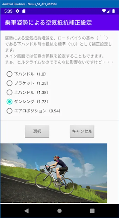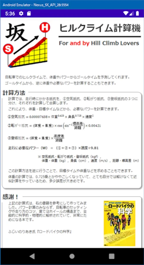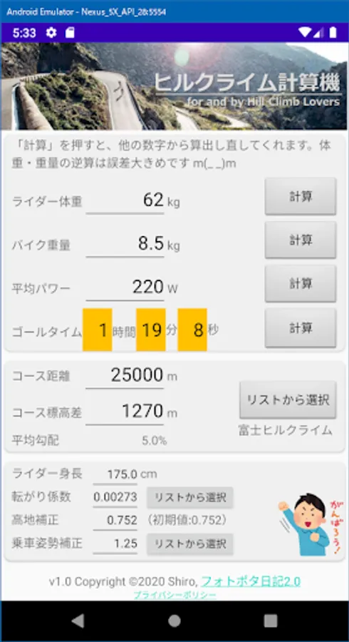 自転車で峠を上る際に、体重・パワーからゴールタイムを予測してくれます。また、逆に目標タイムから必要なパワーや減量を計算してくれることもできます。