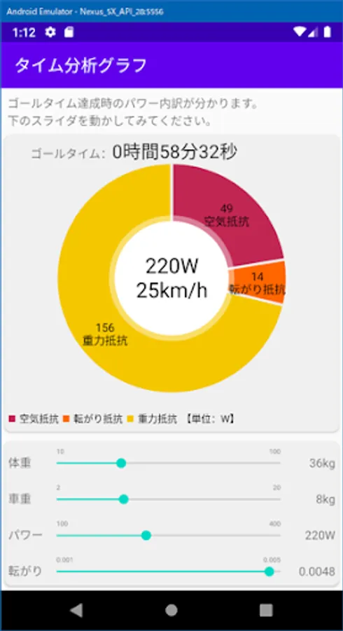 計算は、諸設定データから転がり抵抗、風力抵抗、重力抵抗の3つを求め、自分の平均パワーでどれだけの速度が出せるかをもとに計算しています。