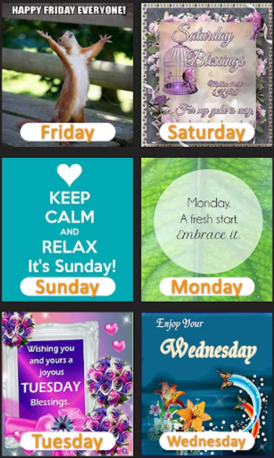 Wishes and Greeting cards from Monday to Sunday make your day special. You can wish everyday to your lover, family an friend by just on 1 click by pressing share button. Beautiful bible quote and other greeting cards with them and have a blessed day everyday.