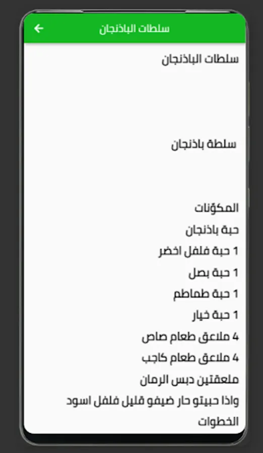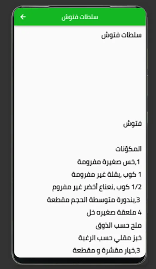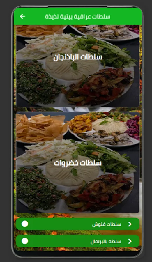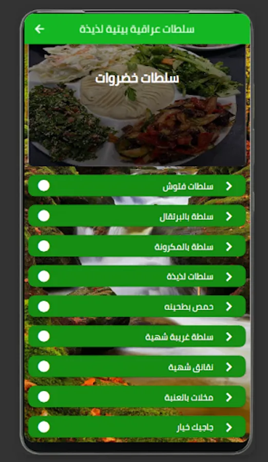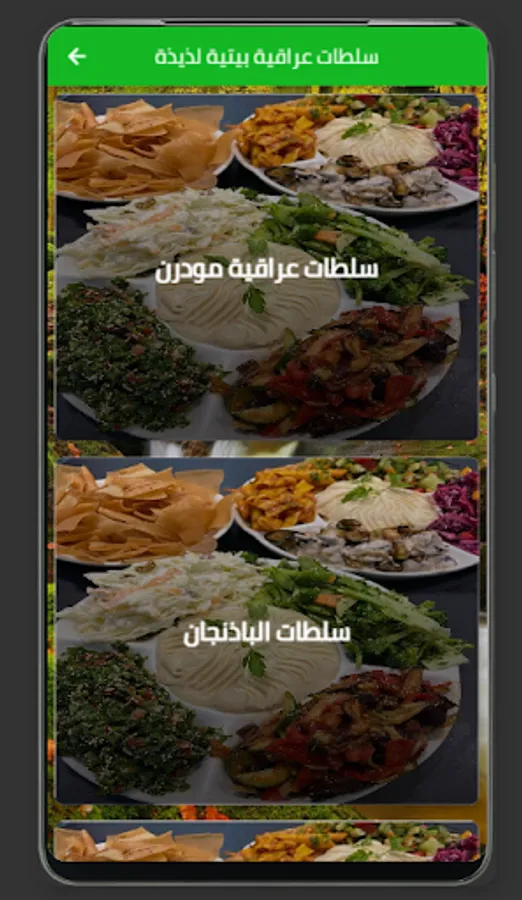 The list of recipes offered by the app includes many different items, including fattoush, tabbouleh, shirak, Iraqi green salad, Iraqi salad with peas, and many more.