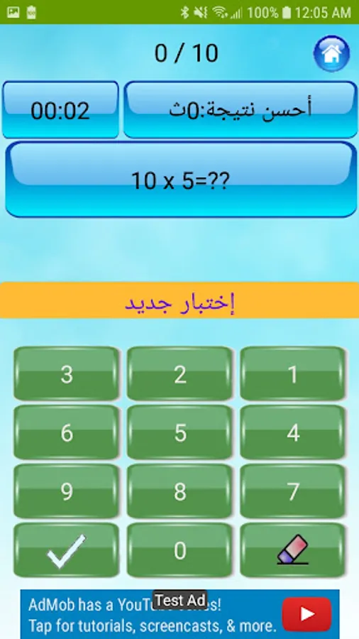 نشاط الاختبار: يقيس مستوى المستخدم في جدول الضرب من خلال إجراء اختبار مع تسجيل أفضل وقت لإكمال الاختبار.