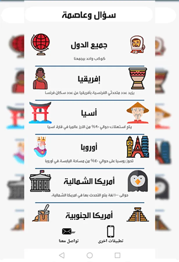 تطبيق معلومات عامة - اسئلة عواصم العالم يختبر مدى معرفتك بعواصم دول العالم حيث ينقسم الى 6 اقسام. حيث القسم الاول يحتوى على كل دول العالم و الاقسام الخمسة الاخرى يحتوى كل قسم على عواصم كل قارة على حدى
