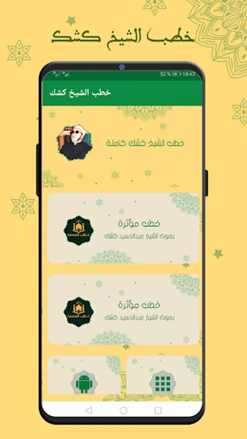 يحتوي الشيخ كشك محاضرات بدون نت وهي باقة من اجمل خطب كشك بدون نت. ان كنت من محبي الشيخ كشك فما عليك سوى تحميل تطبيق خطب الشيخ عبد الحميد كشك بدون نت والاستمتاع .