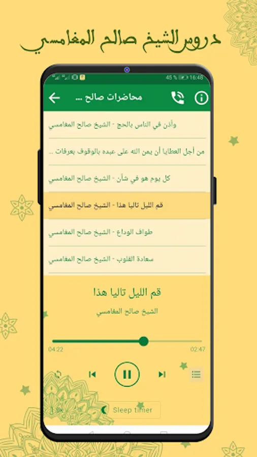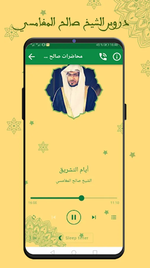 The application of Sheikh Saleh Al Maghamsi’s sermons without the net goes to the background in the event a phone call is received and then continues listening after the call is completed.