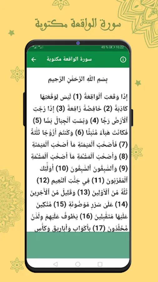 The application of Surat Al-Waqi’ah written without the Internet in a large font with background sound in the event that a phone call is received and then continue listening after the call is completed.