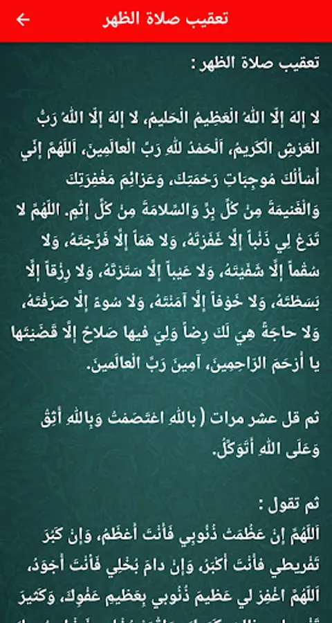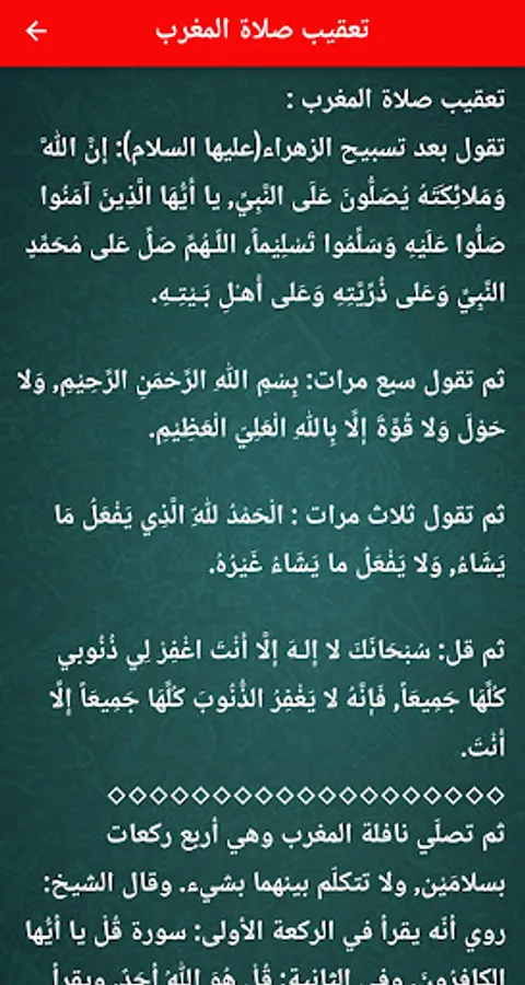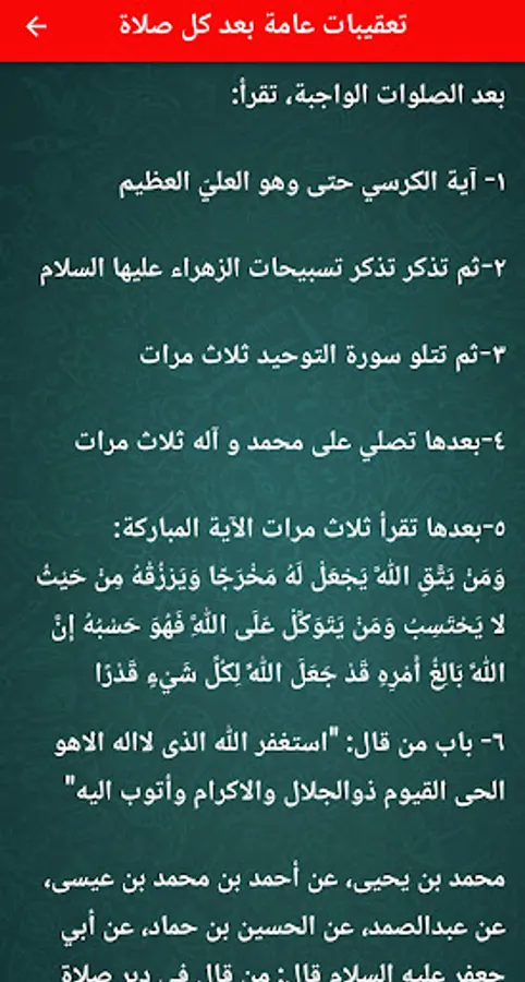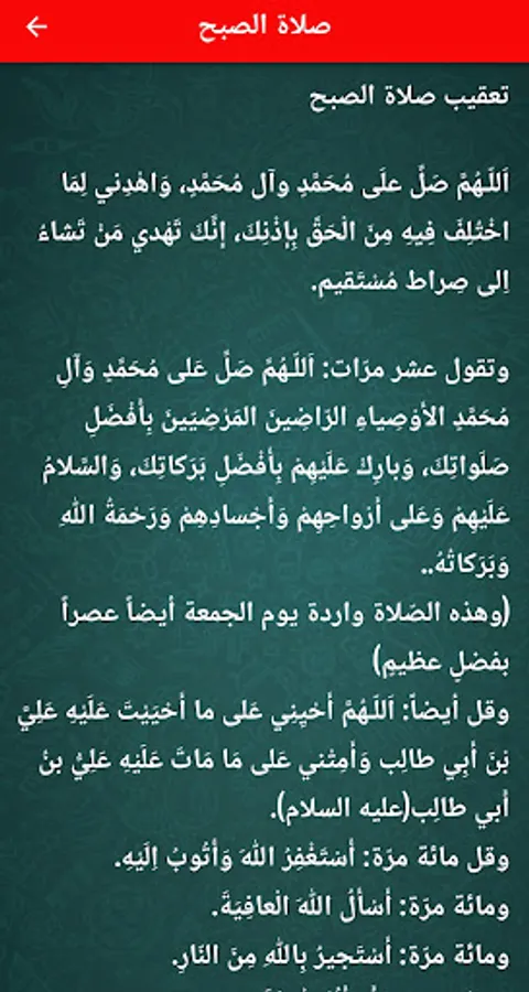 The application contains general comments for prayer, such as the praise of Zahra, Quranic verses, and other praises