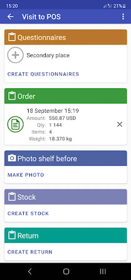 The mobile platform allows to generate any desired workflow constraints and checks for each agent. As the job, the agent can immediately see the results of the current account, the history and information about the completeness and correctness of the entered data.