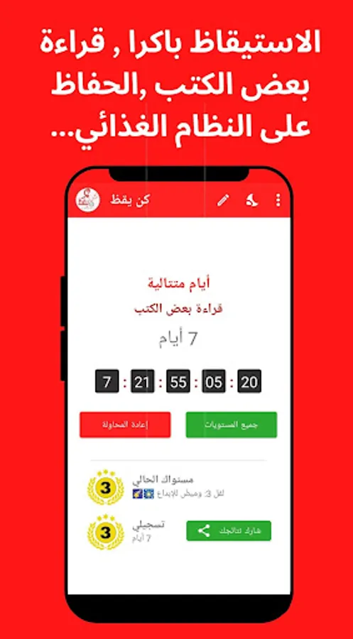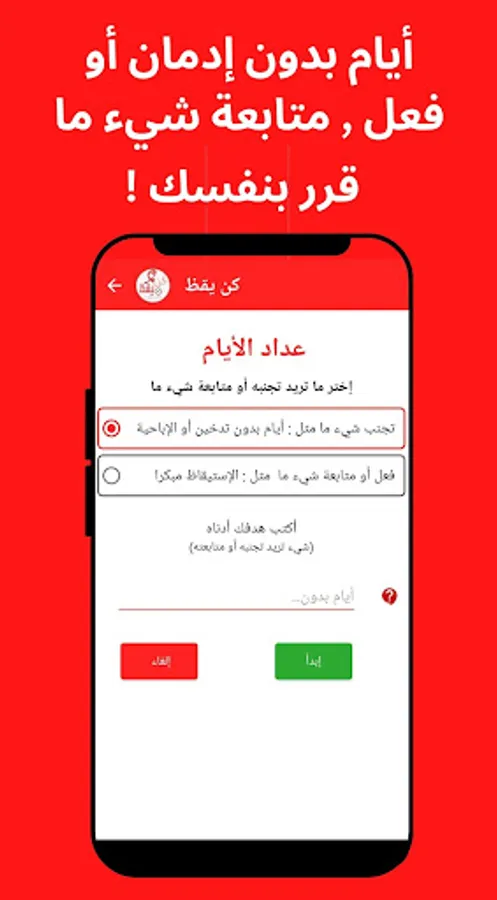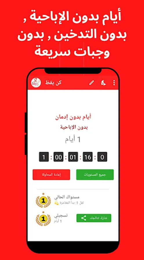 كن يقظ هو تطبيق لعد الأيام بهدف تجنب الإدمان أو متابعة شيء معين وشعار التطبيق