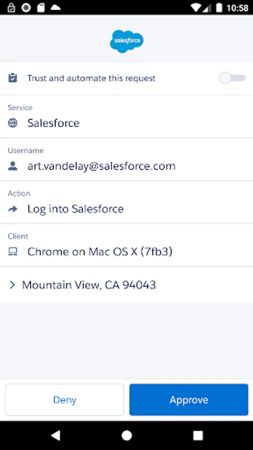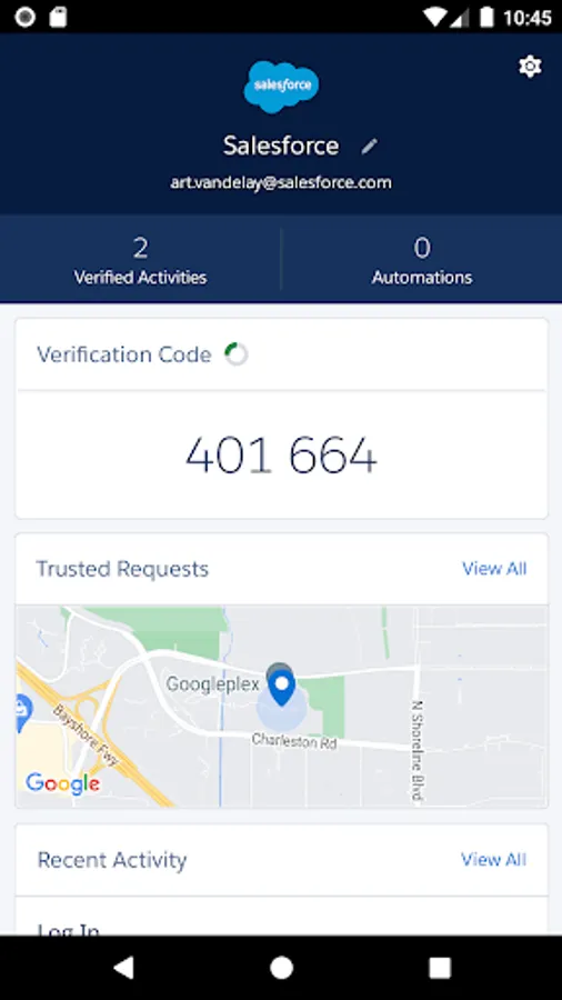 Salesforce Authenticator adds an extra layer of security for your online accounts with two-factor authentication. With Salesforce Authenticator, you use your mobile device in addition to your password to verify your logins and other account activity. The app sends you a push notification, and you respond with just a tap. For even more convenience, Salesforce Authenticator can use your mobile device's location services to verify you automatically from trusted locations, like your office or home. You can also get a one-time verification code that can be used when you're offline. Salesforce Authenticator works with the entire Salesforce Platform—Sales Cloud, Service Cloud, Marketing Cloud (ExactTarget), App Cloud, and Analytics Cloud.