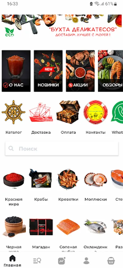 Bay Delicatessen online store, red caviar and seafood delicacies. Delivery and pickup in Moscow and the Moscow region. The store's assortment is very rich. Premium class caviar, Kamchatka crab, a variety of shrimp, salted and chilled fish, shellfish and various seafood products from all over the world are always available. Convenient mobile application. A full range of products, easy search, payment and delivery of the selected product. Notice of discounts on various products. Cumulative system of discounts and bonuses.