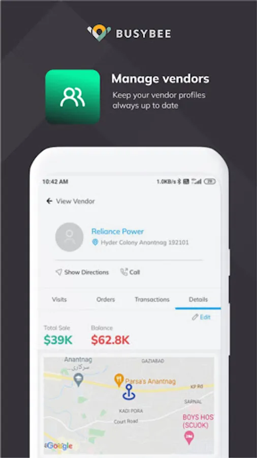 BusyBee is a versatile, powerful but easy to use vendor management tool that enables businesses and salespersons to map physical locations of their vendors as well as track sales activities and orders of all vendors. BusyBee features handy tools like sales visit planner to organise daily sales visits, order tracker to track and fulfil vendor restocking orders and a transaction monitor to view, edit, delete and manage all transactions.