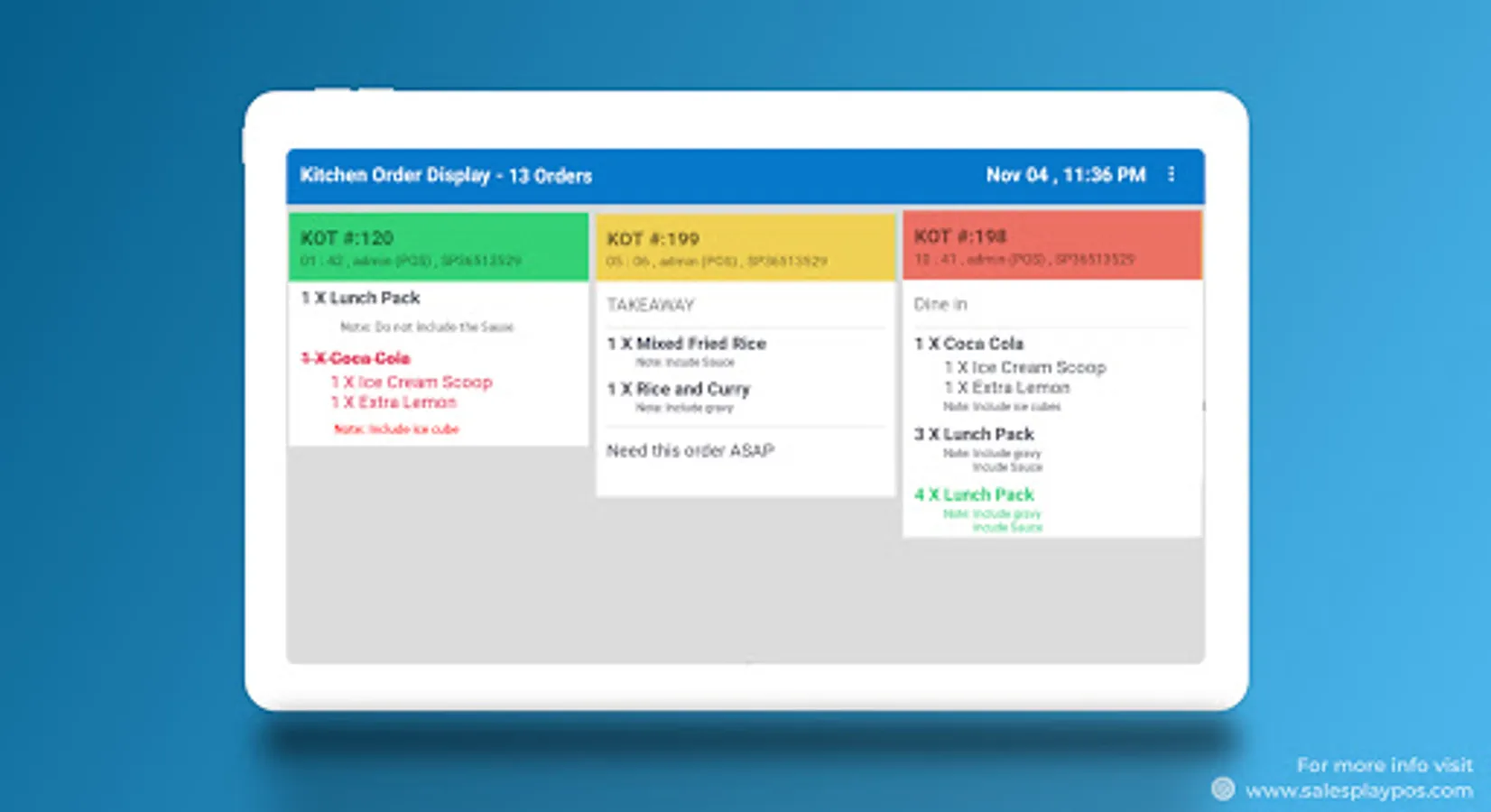 Use Kitchen Display System to inform kitchen staff what to prepare from an order. Improve order times and accuracy with Sales Play kitchen display System.