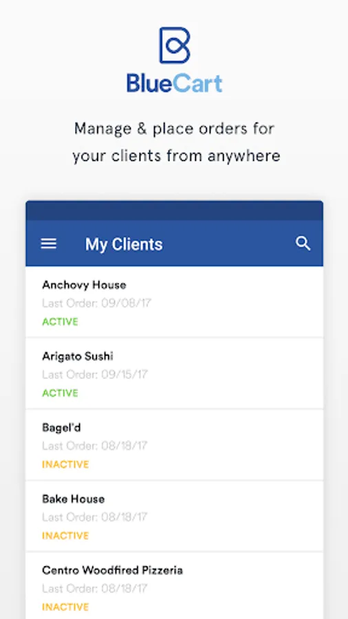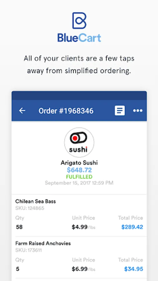 BlueCart is the go-to sales app for distributors, suppliers, vendors, and brands serving the hospitality industry. Owners, managers, and sales reps use BlueCart to communicate with their customers and manage orders, allowing their buyers to purchase their specialty goods more effectively and increasing sales.