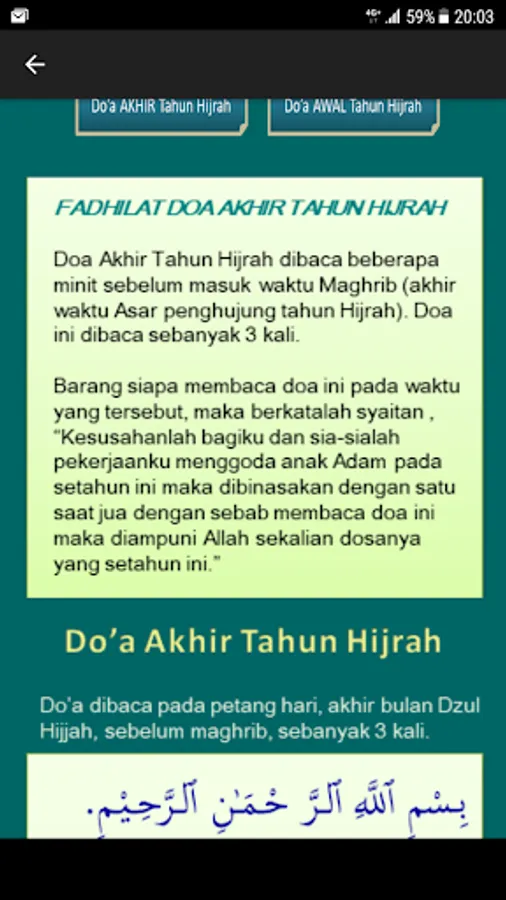Applicability prayer (prayer) Last, the Beginning Hijrah year, we also include verses in Latin spelling for those who need them. We precede it with gratitude to all the users of the application Du'a (prayer) Last, the Beginning of the Hijri year. We hope that by reading the Du'a (prayer) End of the Hijri year ago our sins forgiven by Allah and we can be in the mercy of God always. And hopefully by reading the Du'a (prayer) at the beginning of the Hijri year, God will always protect us all from all calamities and temptations of the devil ... Aamiin ... In Shaa Allah.