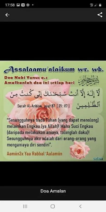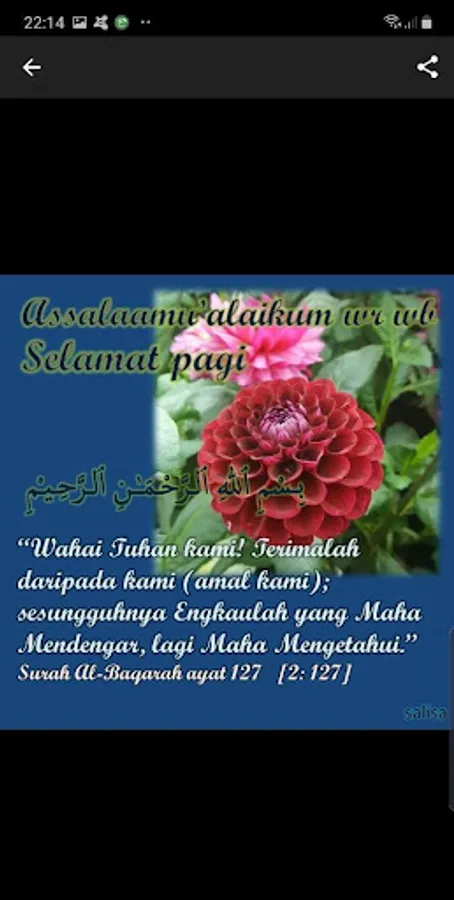 There are many Words of Encouragement, Reminders, Motivation as well as Prayers from the Quranic verses that we include in this Greeting Prayer Application. You can send Pictures of the Greeting Prayer to your friends, your family, your contacts. We extend our heartfelt thanks to all the users of this Greeting Prayer Photo Application. Hope you enjoy using this application ... Aamiin.