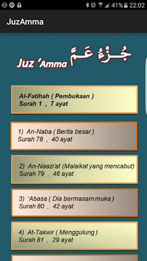 We include transliteration, reading in roman / latin is to help rakan2 who are just learning or are not proficient in reading Quran recitation. Keep learning to act in order to read the holy Qur'an with Tajweed more accurate. Applicability Juz 'Amma is an application that we produce as an easy reference for us to read verses from chapters to 30 in the Al-Quran. Juz 'Amma began with Surah An-Naba, sura 78 and ends with Surah An-Naas, chapter 114. We include Al-Fatiha in the application Juz 'Amma us.