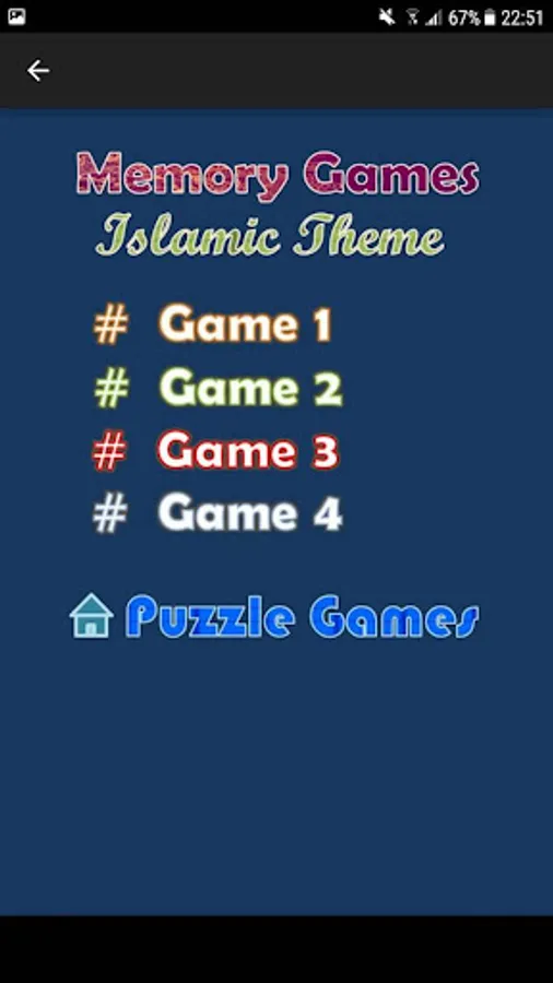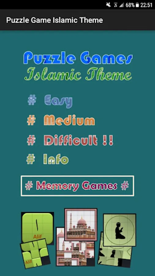Puzzle Game Islamic Theme is a unique application that challenge you to arrange the puzzle game, while at the same time, feeds you with some basic knowledge on Islam, The Five Pillars of Islam. There are 3 levels of puzzle games for you to choose from.
