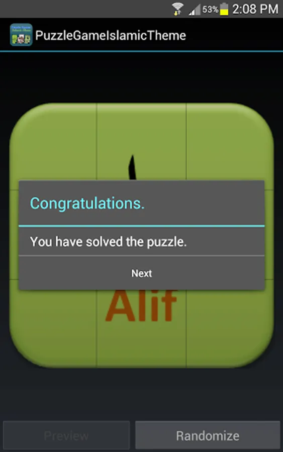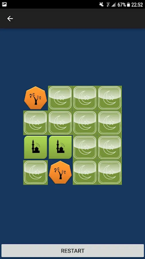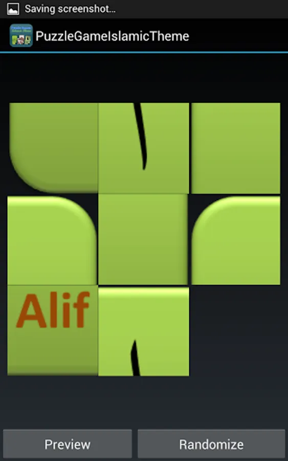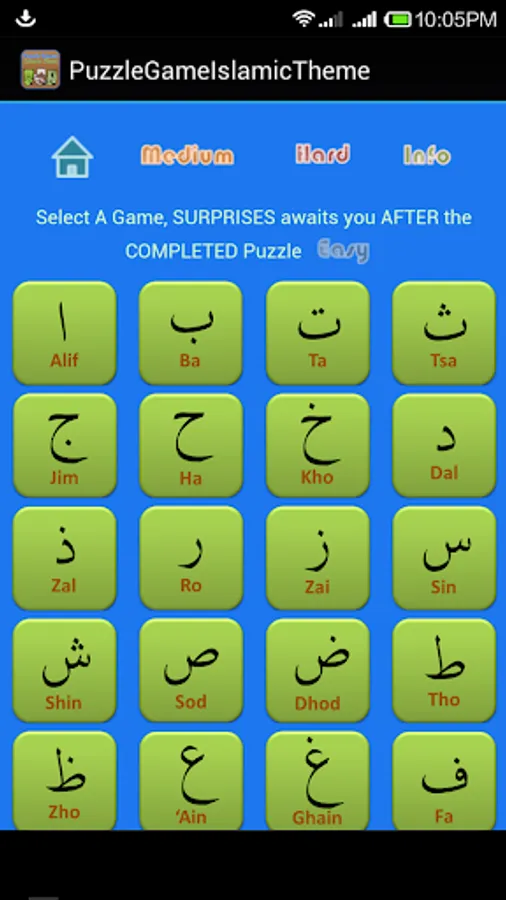 The EASY level puzzle game consists of the Arabic Alphabets (Alif to Ya). The spelling of each letter in English/Latin alphabet may differ slightly with region, but the pronunciation is expected to be the same. The MEDIUM level puzzle game consists of Islamic Symbols like solah, muslim prayers.