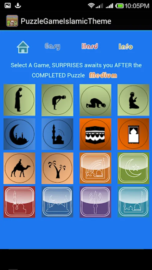The HARD & DIFFICULT!! level puzzle game consists of pictures of Mosques from around the world. We also include an Info page, a short write-up on the puzzle game. We hope you will enjoy this game. Thank you for installing/trying out this Puzzle Game Islamic Theme.