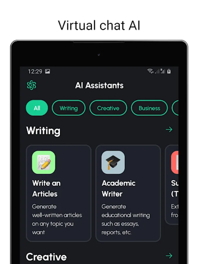 With Virtual chat AI, you have access to personalized assistance for all types of writing , whether it is essays, homework, compositions, social media posts, or poems. Basically, the Chat GPT app can assist with any task, such as crafting a unique and unforgettable pickup line or even creating an original song. That's right! This ChatGPT AI helper is not only smart but also creative. Let your imagination run free with it!