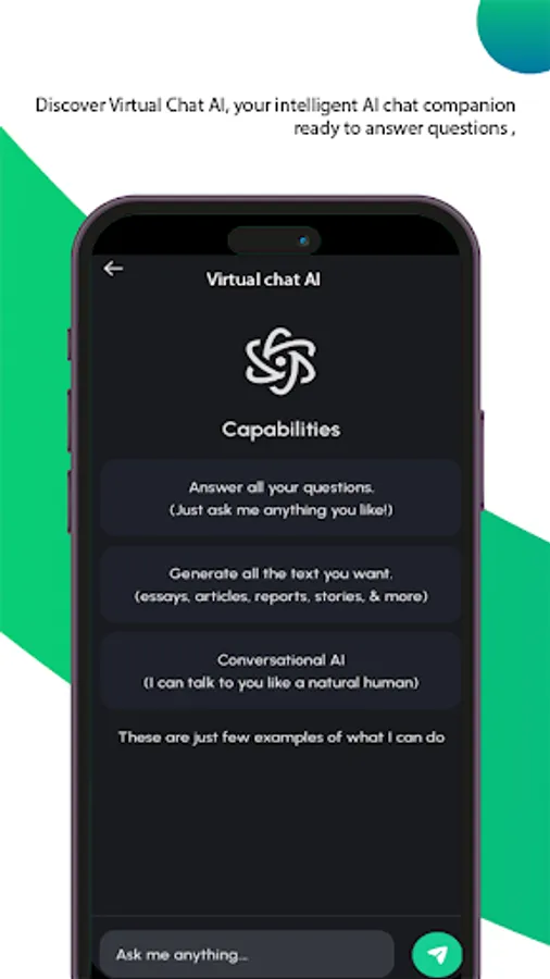 🤖 Smart Conversations: Chat with our advanced AI chatbot that understands and responds to your natural language. Whether it's answering questions, providing recommendations, or just having a friendly chat, Virtual chat AI - Ask AI is your perfect companion.