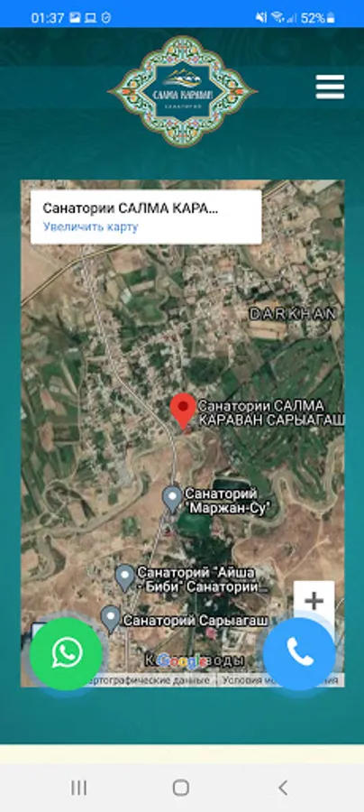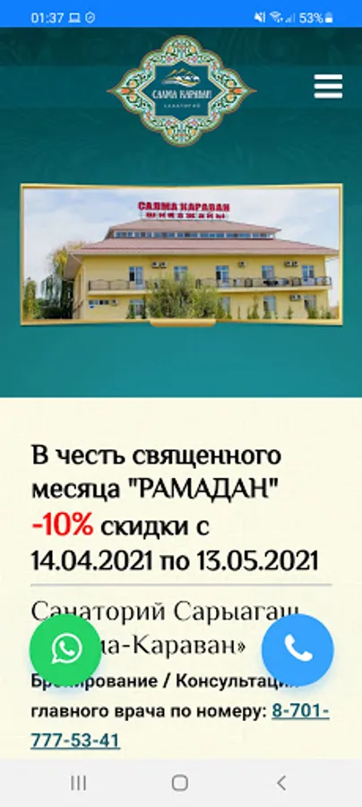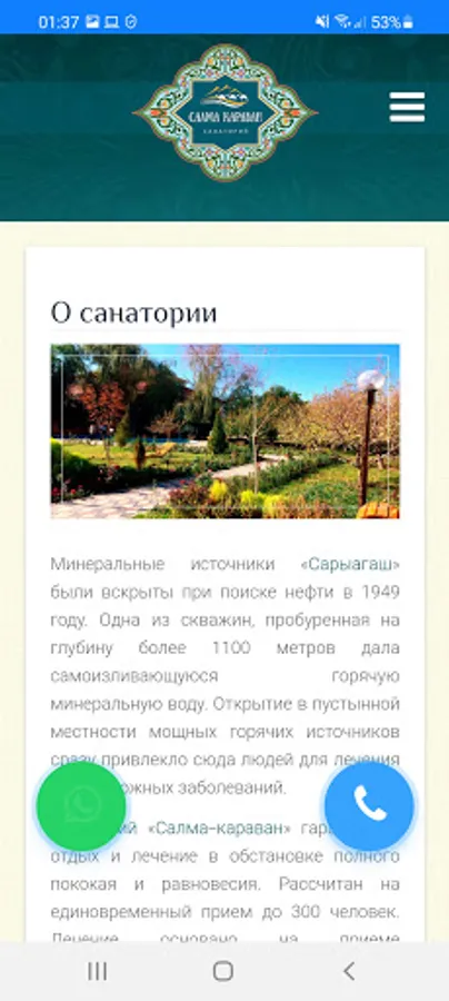 Sanatorium "Salma Caravan" guarantees rest and treatment in an atmosphere of complete peace and balance. Designed for a one-time reception of 300 people. The treatment is based on the intake of mineral water from the Saryagash well. Comfortable double junior suites of European standard are equipped with modern equipment and will delight you with coziness and comfort. Sanatorium "Salma Caravan" is profiled according to the effects of mineral water on the human body.