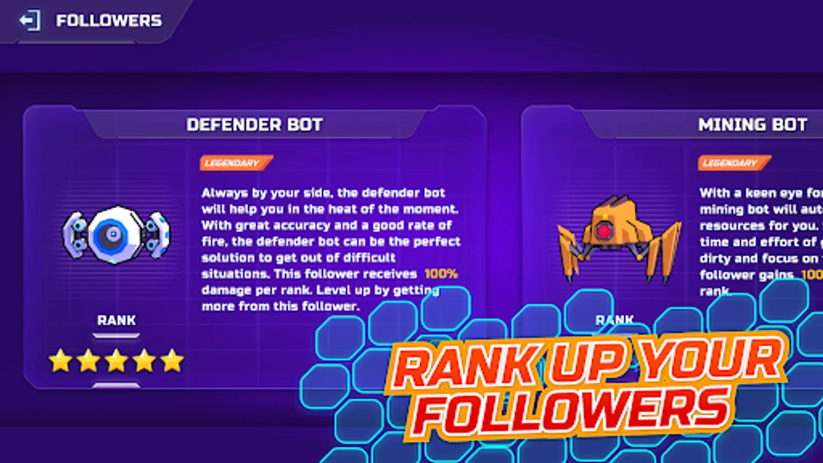 Ranking up your robot followers will make your life easier on the battlefield. These bot followers specialize in everything from improving your mining speed to saving your life in a fight.