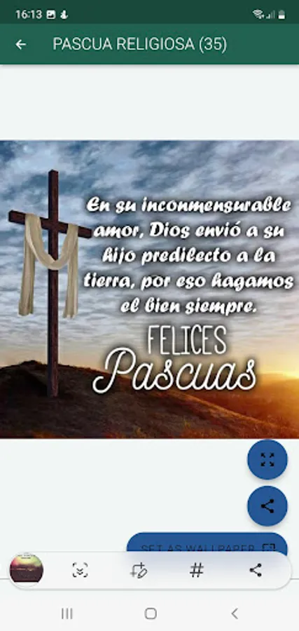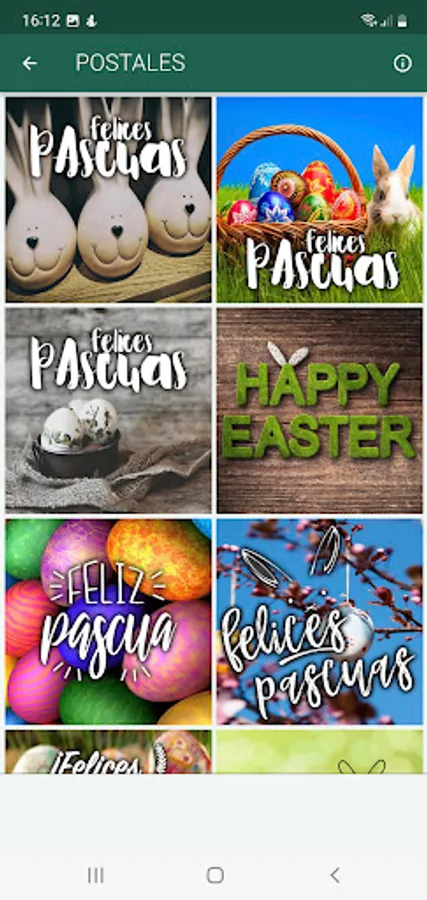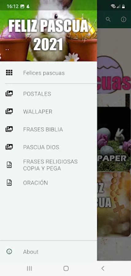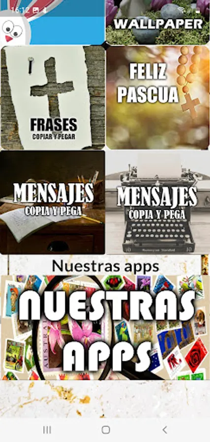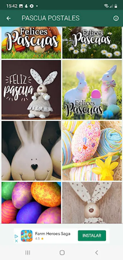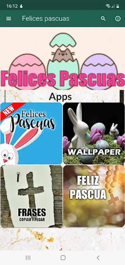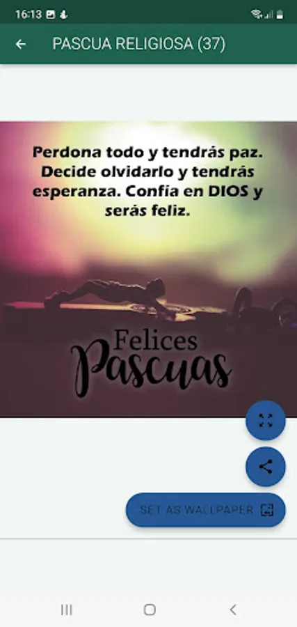 With our beautiful images you can congratulate Easter to all your loved ones or share on your social networks. It is a very complete application in which you can find: Beautiful postcards to congratulate Easter, wallpapers of eggs and rabbits, beautiful images with religious phrases, phrases to copy and paste, and prayers for this beautiful time of year.