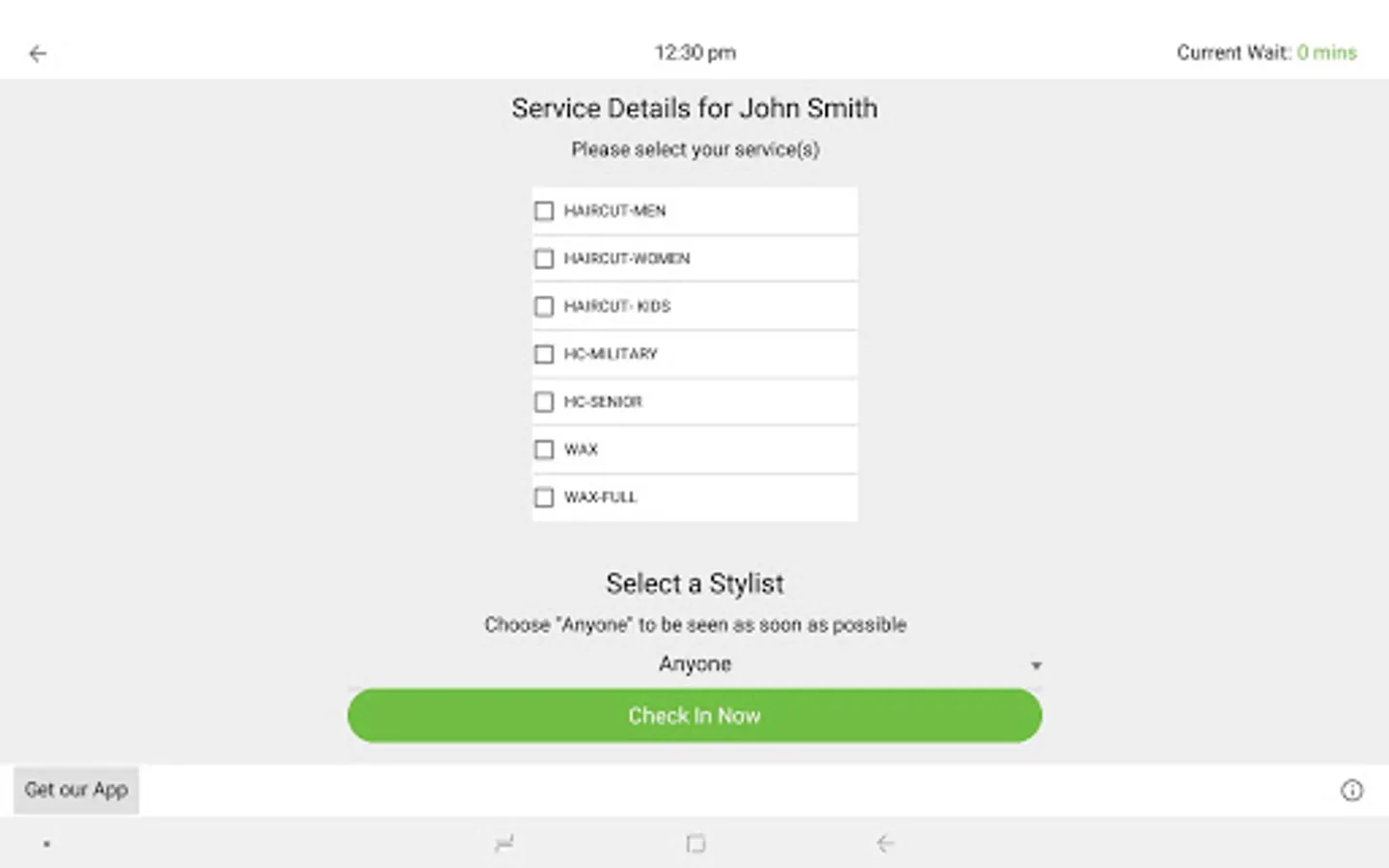 From a device displayed at the front of the business, clients can easily check themselves in for an existing appointment or create a new walk-in appointment.
