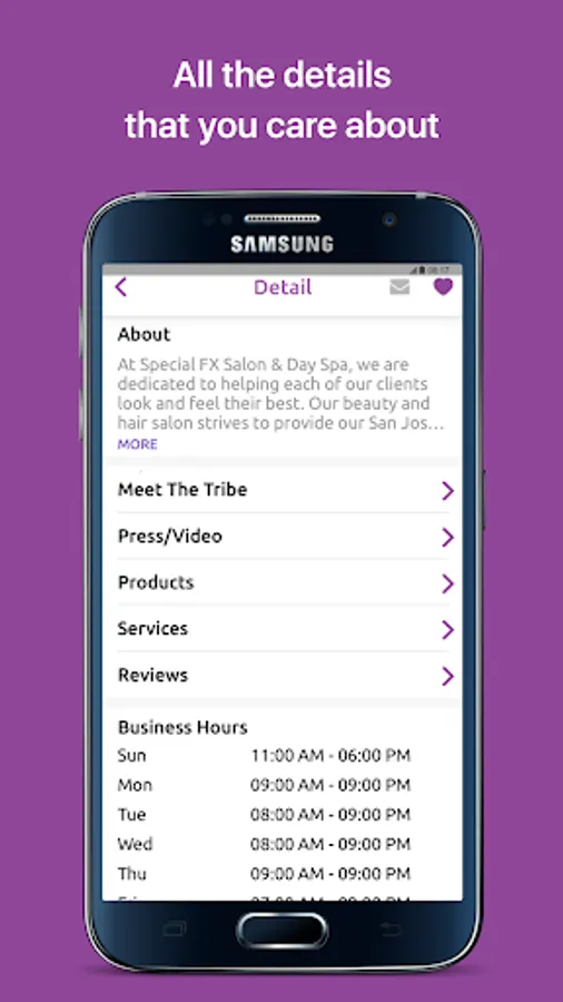 Owners are able to create a complete salon, spa or barbershop profile on the Salonch app. With a photo gallery, a description about the salon, and Meet the Team with staff bios, owners can also add press and videos, list the products used and retailed, add their service menu and so much more.