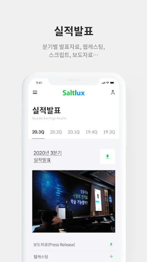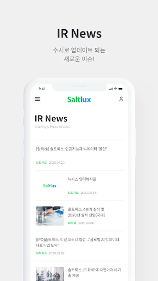 This app provides the latest IR information such as real-time stock prices, IR schedules, quarterly earnings release data, various IR news, major business reports, financial information, disclosures, and IR contact information.
