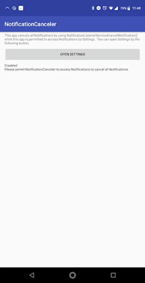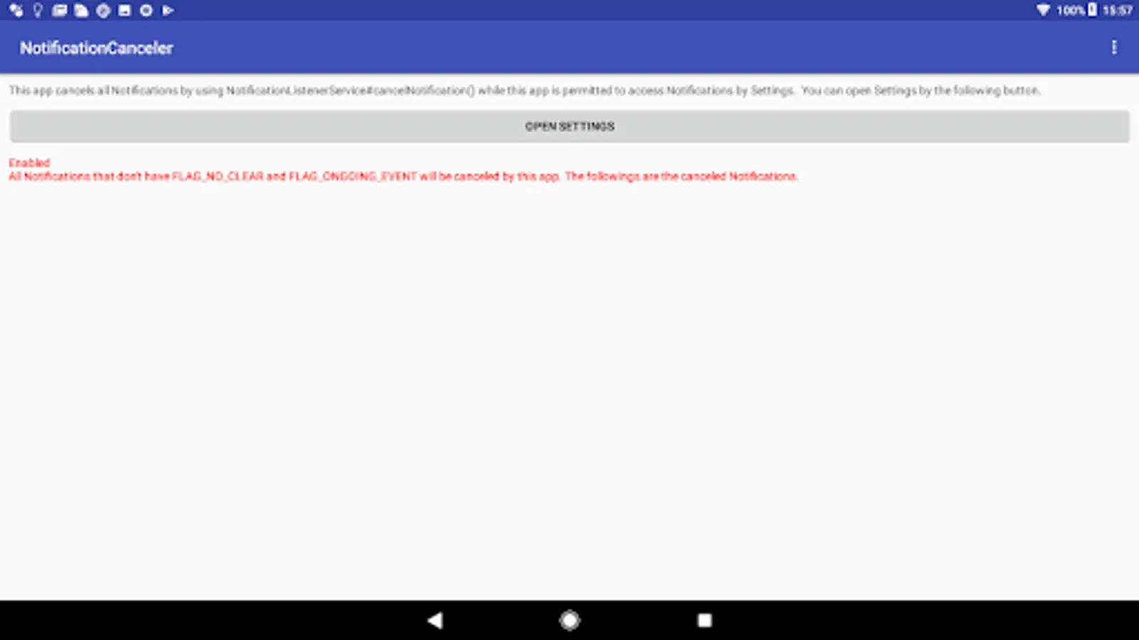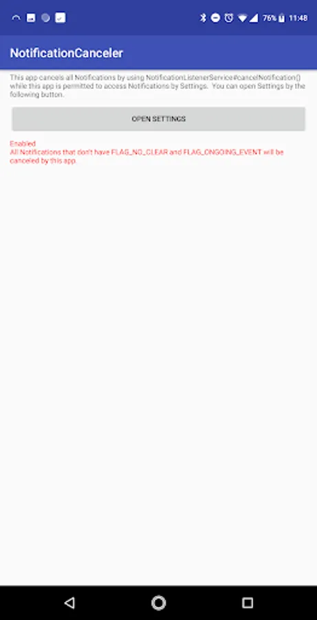 This app cancels all Notifications that don't have FLAG_NO_CLEAR and FLAG_ONGOING_EVENT by using NotificationListenerService#cancelNotification() while this app is permitted to access Notifications by Settings.