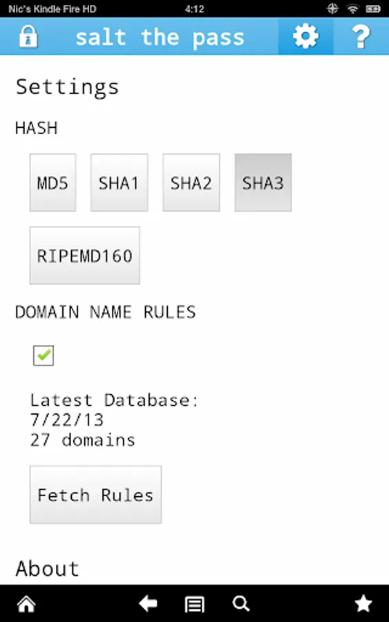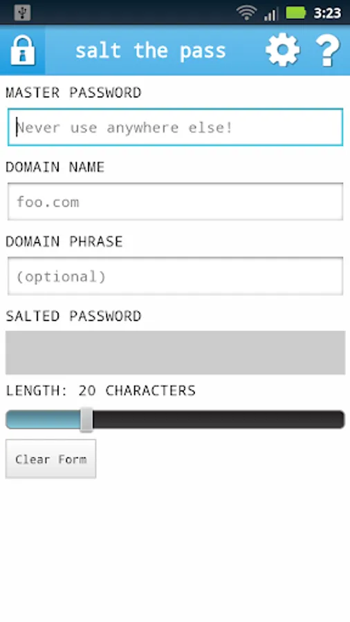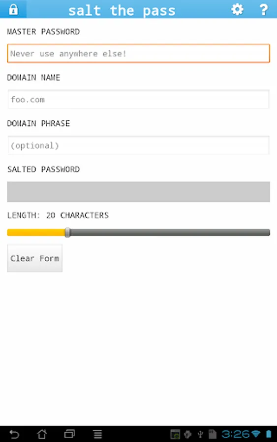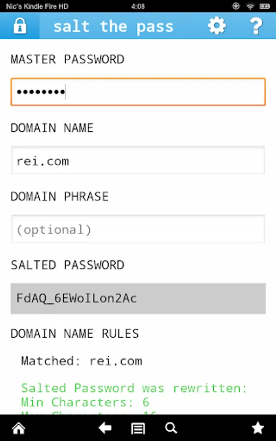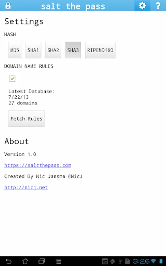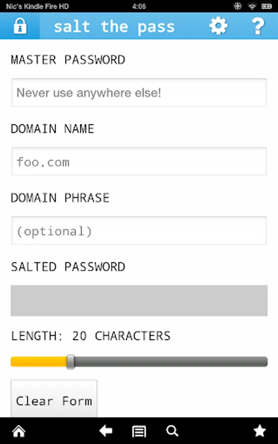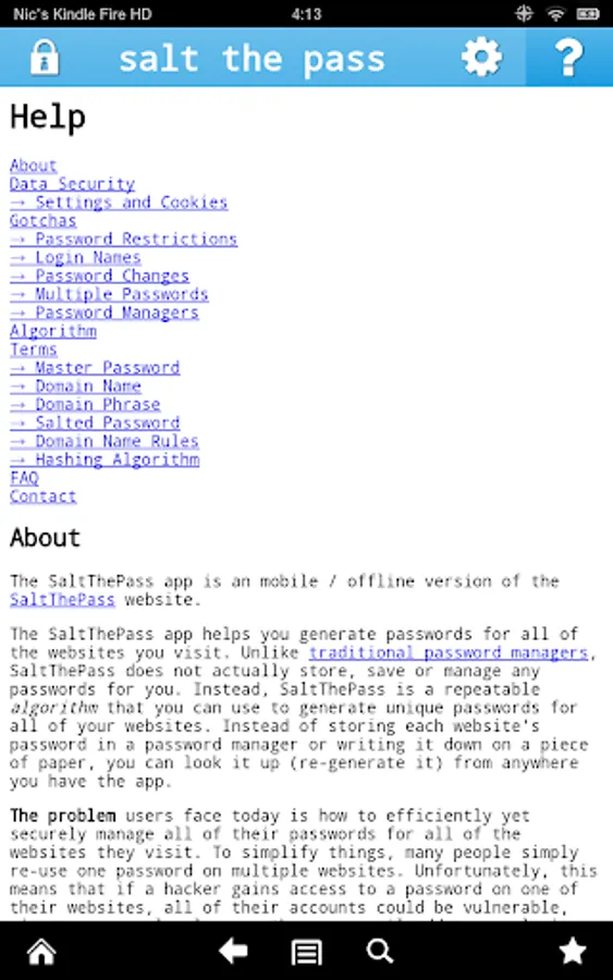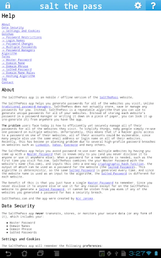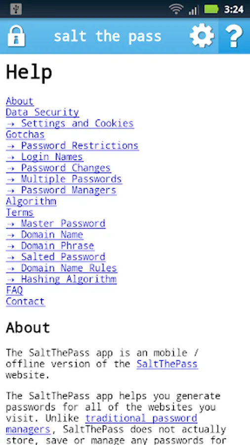 SaltThePass is a companion app for https://saltthepass.com. SaltThePass is a password generator that will help you generate unique, secure passwords for all of the websites you visit based on a single Master Password that you remember.