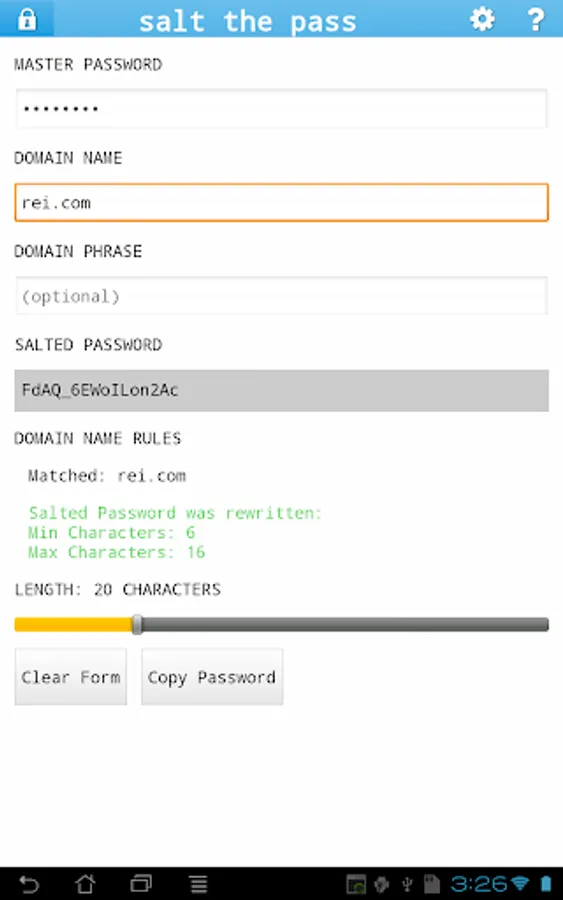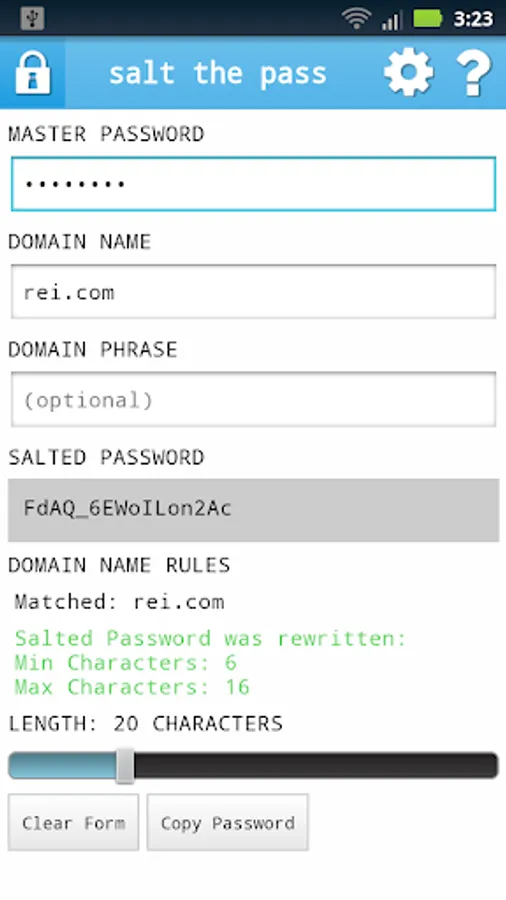 The benefit of this is that you just have a single Master Password to remember. Since you never disclose it to anyone else or use it for any reason except for on the SaltThePass website to generate a Salted Password, it cannot be stolen from you even if any of the websites you generated a password for has a security breach.