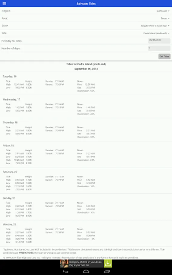 The Saltwater Tides app is your source for tide, moon and sun predictions for the Gulf Coast, US East Coast and US West Coast. (Hawaii and Alaska are not included.)