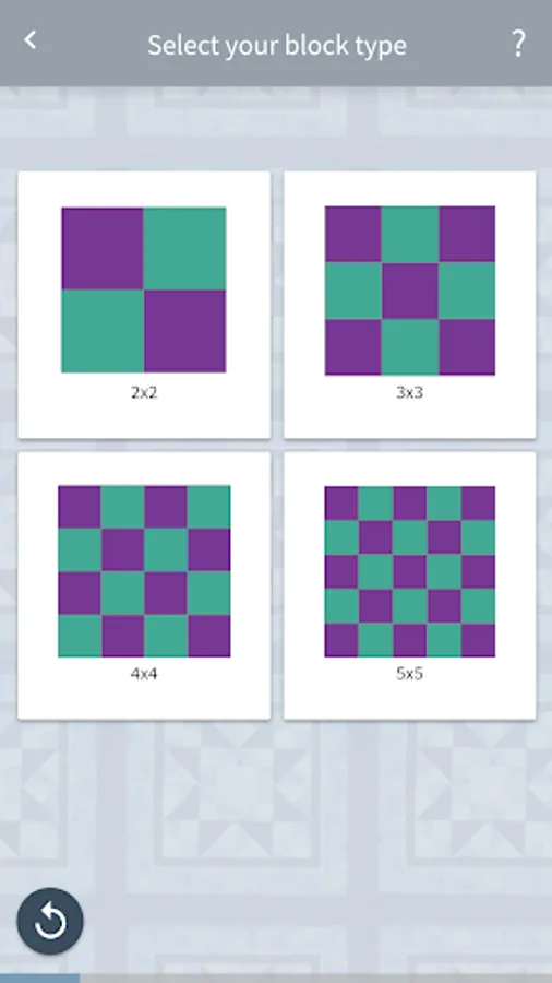 We first start by learning more about the Quilt Type you are working on. This could be a block pattern of 2x2, 3x3, 4x4, or 5x5. All of our measurements represent using 5” squares that you will cut down to 4”.
