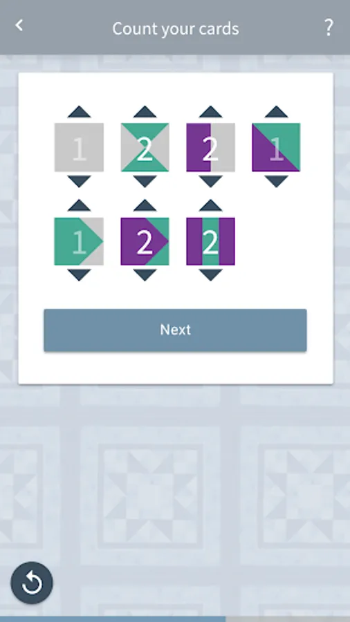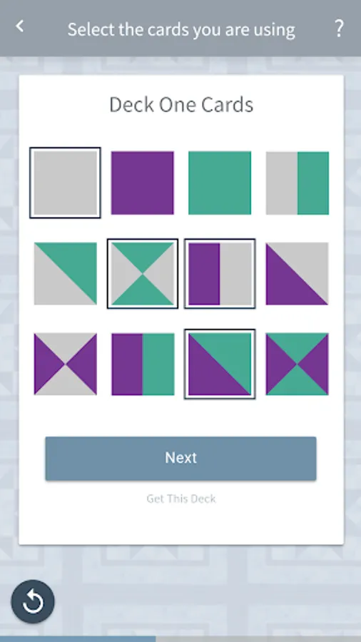 Next, you are going to want to put together the cards from your design together and select them on the app by tapping on the cards you used for your design. We will prompt you for all three decks until you have inputted all your cards. After having inputted the cards, you will then want to count how many of the same cards you have selected and enter the number of the blocks you will be creating. Once you input this information you will be able to move forward.