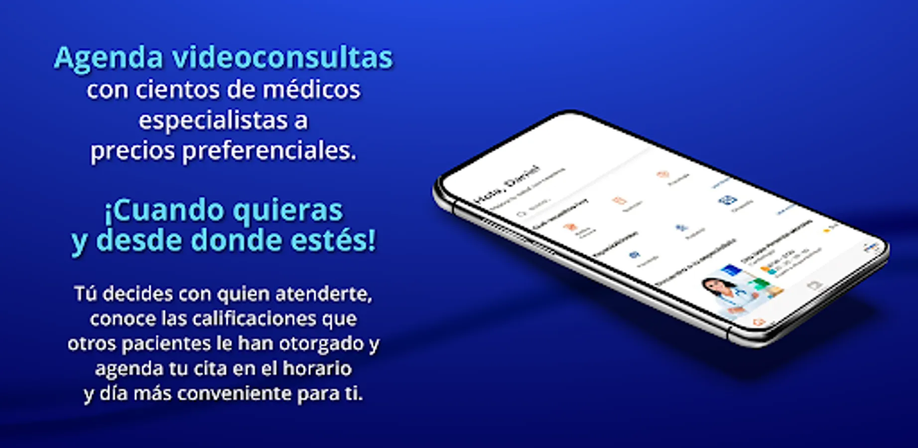 Schedule video consultations with hundreds of specialist doctors at preferential prices whenever you want and from wherever you are! You decide who to attend you with, know the qualifications that other patients have given you and schedule your appointment at the most convenient time and day for you,