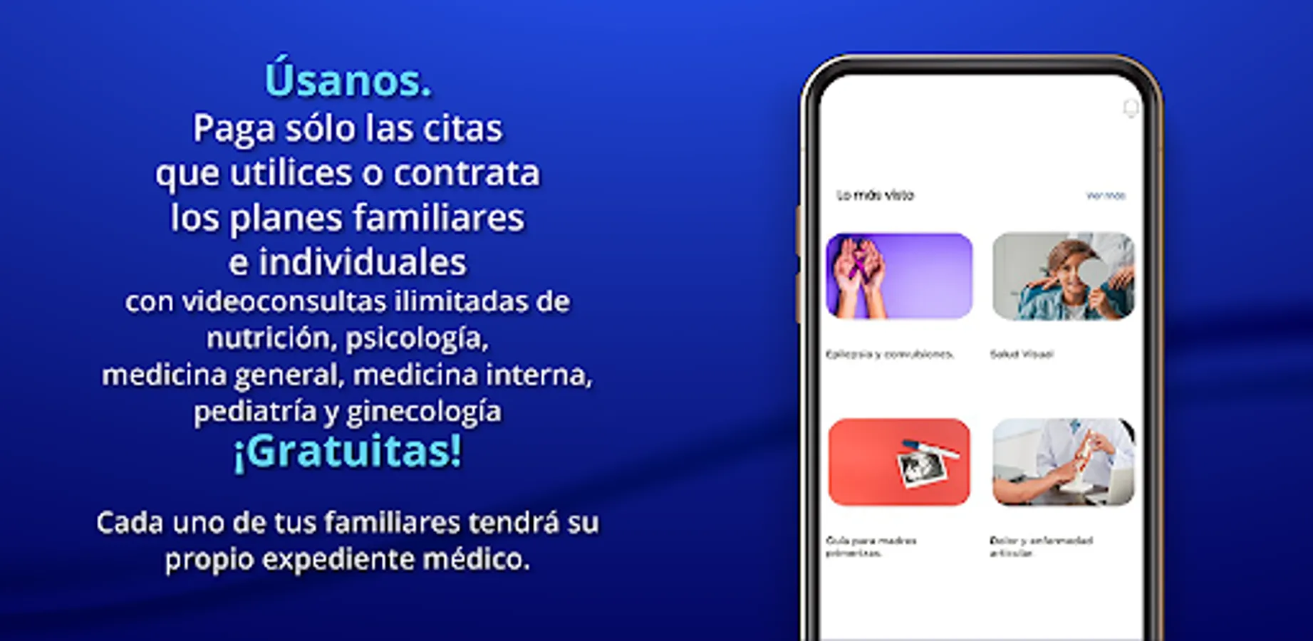 use us. Pay only for the appointments you use or contract family and individual plans. With unlimited video consultations on nutrition, psychology, general medicine, internal medicine, pediatrics and gynecology. Free! Each of your relatives will have their own medical file.