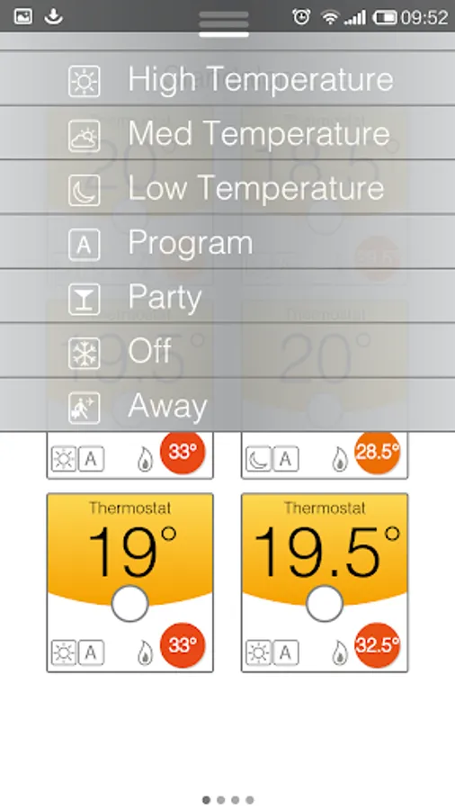 This application allows you to control the JG Aura system. User can change individual thermostat temperature or doing a batch change through preset modes.