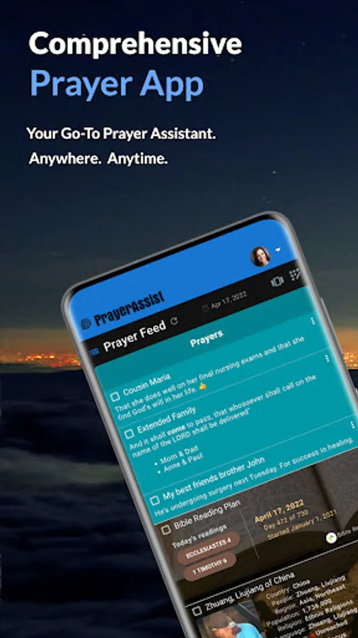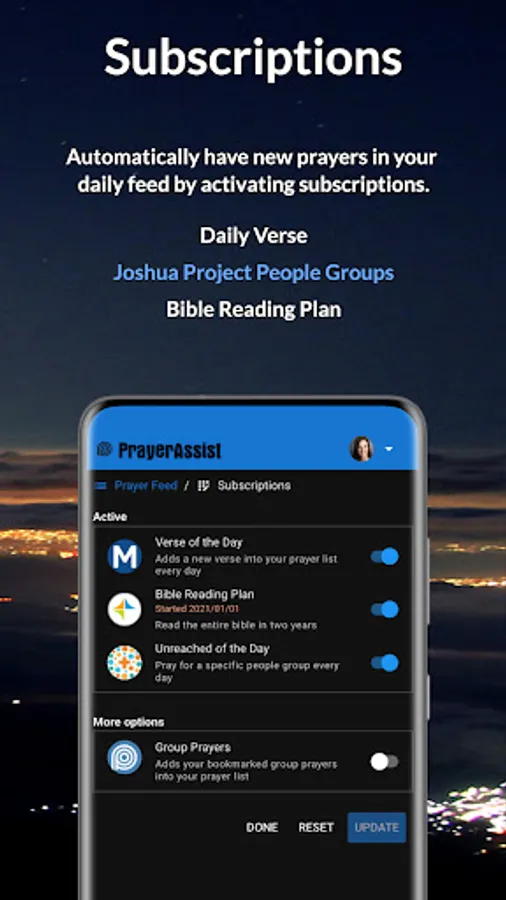• Optionally import prayers from third-party sources including verse of the day, a bible reading plan, and the Joshua Project