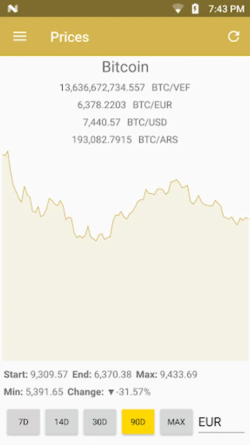 • Check Bitcoin prices in Euro, Venezuelan Bolivar, Argentinian Peso and United Stated Dollar.