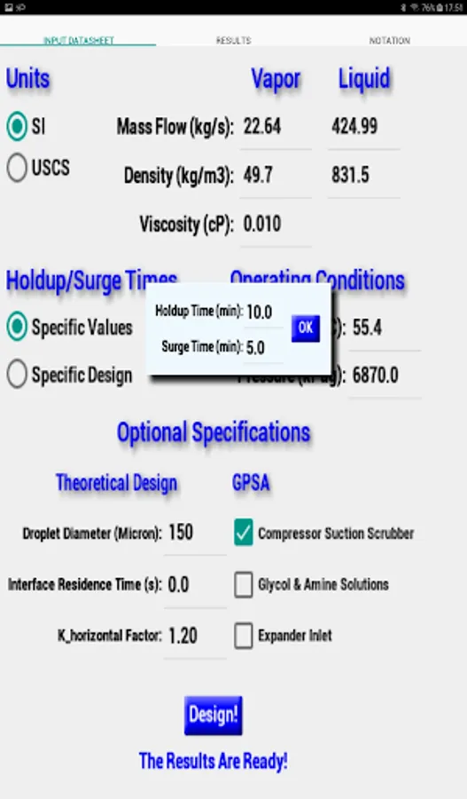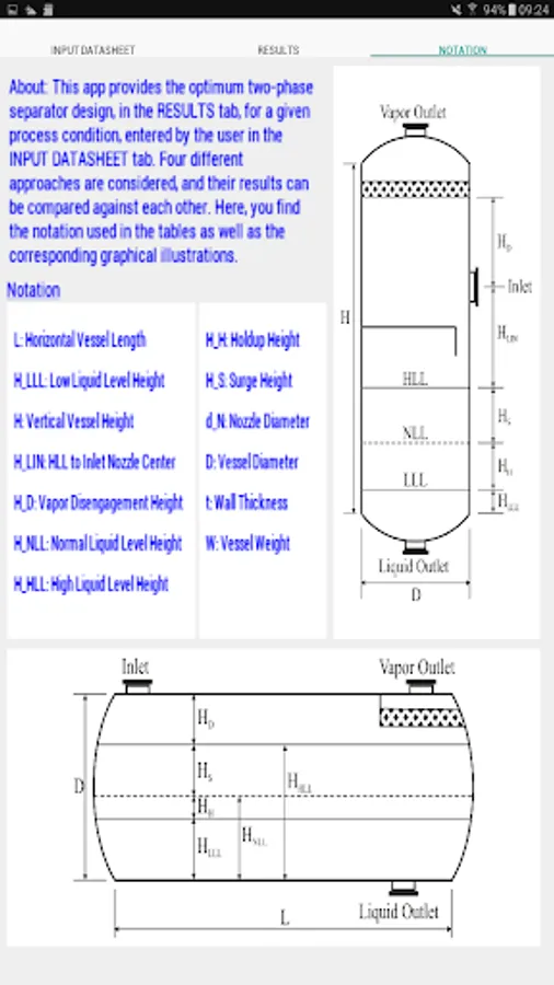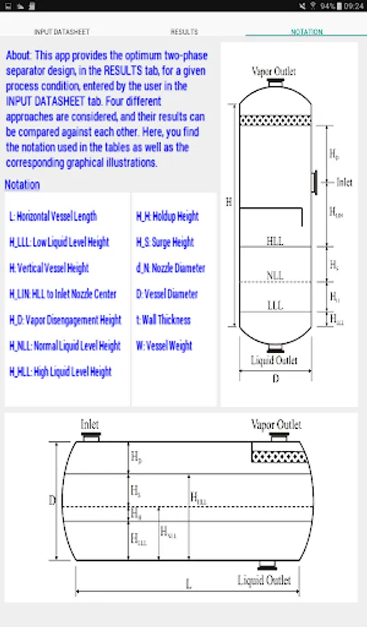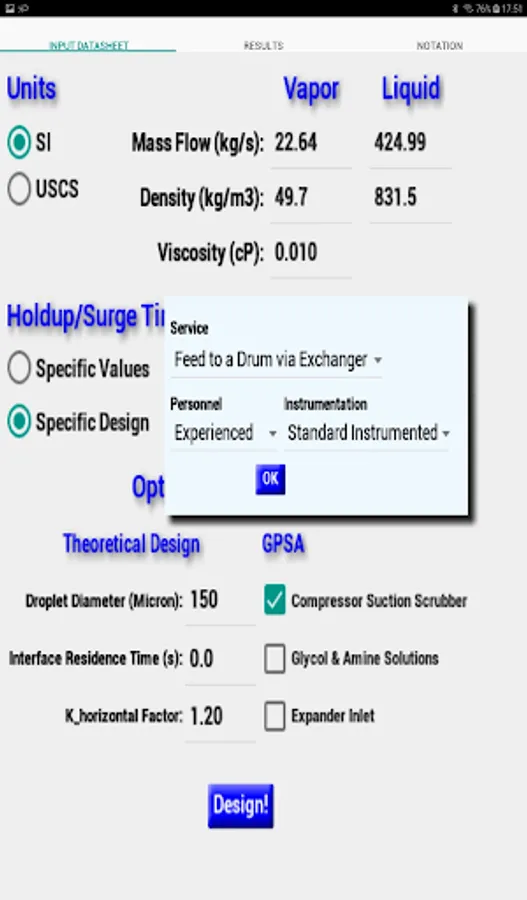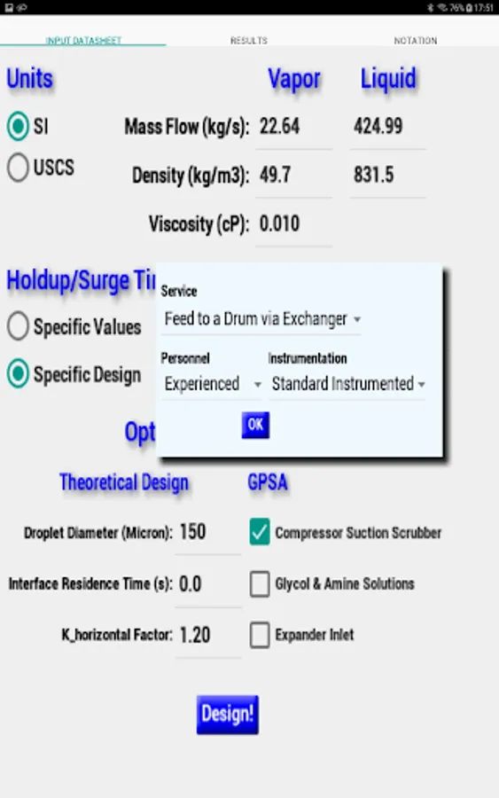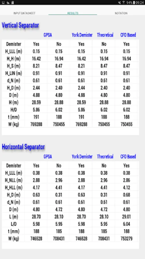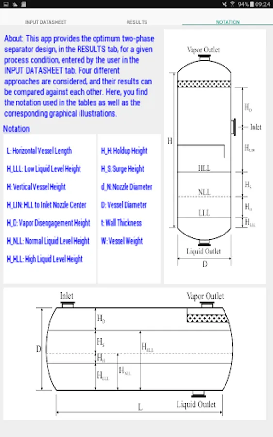This app provides the optimum two-phase separator design for any given process conditions. All well-known classic methods, i.e. GPSA, York Demister, Theoretical, as well as the modern realistic CFD-based approach are included, and their produced results can be compared against each other. The CFD-based approach was presented as a PhD thesis in 2010 by the developer of this app. Note, the popular classic methods are too conservative and usually specify extremely oversized and expensive separators. The CFD-based approach, on the other hand, will confidently propose more economical separators that can successfully accomplish the separation task. So, this app offers a direct tangible benefit for industrial design projects. For background information, please refer to the following literature:
