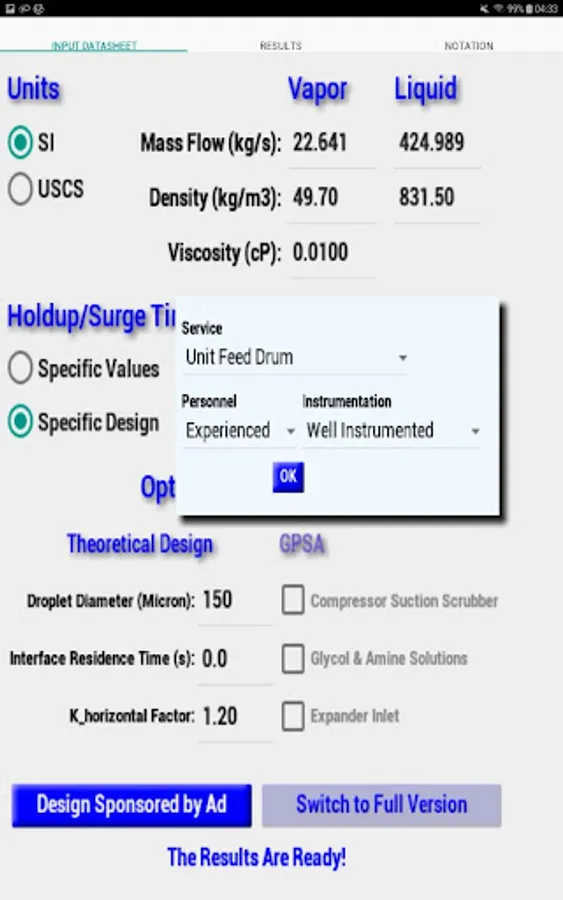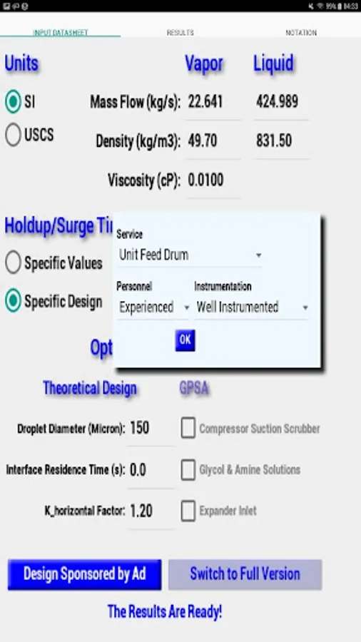 This is the lite version of the equipment sizing app and provides the optimum two-phase separator design for various process conditions. Two different approaches, i.e. York Demister and Theoretical, are included, and their produced results can be compared against each other. Please refer to http://salvasolution.com for background information and technical support.