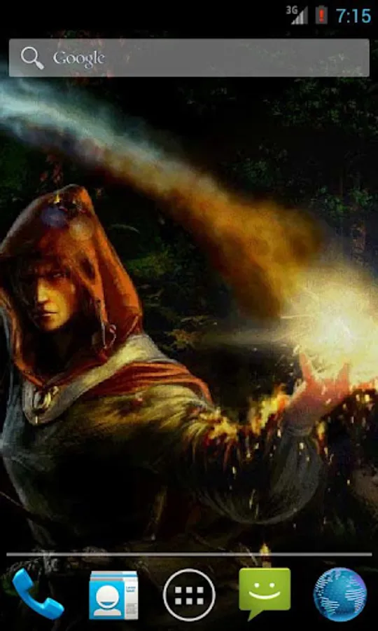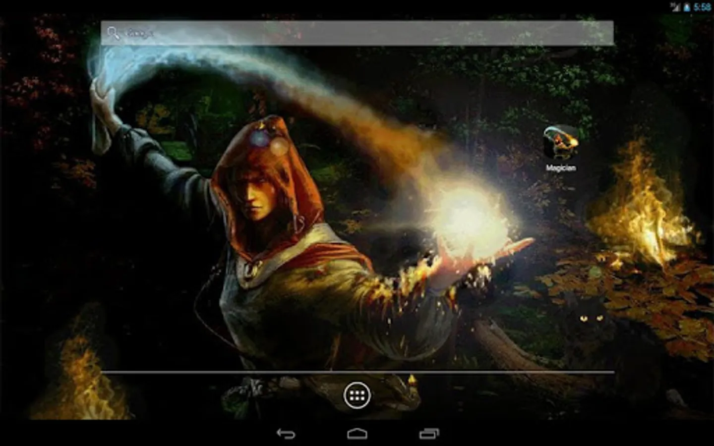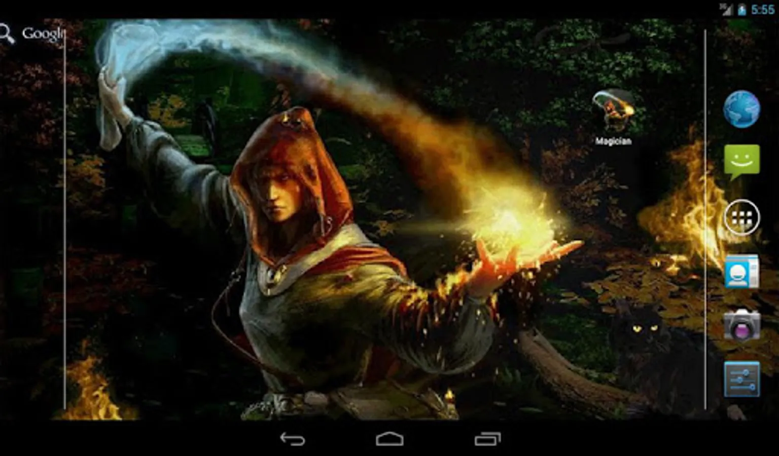 Mysterious sorcerer in a dark forest performs magic tricks with fire, and black cat is looks, bats fly.